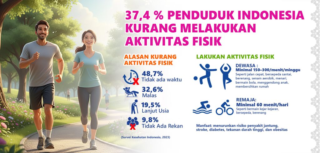 37,4% penduduk Indonesia berusia diatas 10 tahun kurang melakukan aktivitas fisik. Alasan kurang aktivitas fisik adalah tidak ada waktu (48,7%), malas (32,6%), lanjut usia (19,5%), dan tidak ada rekan (9,8%). (Survei Kesehatan Indonesia, 2023)