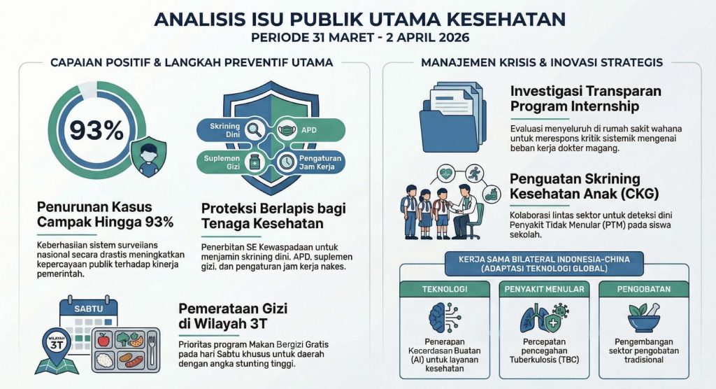 Pemberitaan media massa menyoroti keberhasilan Kementerian Kesehatan (Kemenkes) dalam mengendalikan penyakit menular, khususnya melalui pencapaian penurunan kasus campak sebesar 93% sejak awal tahun 2026. Keberhasilan ini didukung oleh penguatan sistem surveilans dan penerbitan Surat Edaran kewaspadaan untuk melindungi tenaga kesehatan melalui skrining dini, penyediaan APD, serta pemberian suplemen gizi. Selain itu, pemerintah menunjukkan komitmen pada upaya preventif melalui program penguatan skrining kesehatan anak (CKG) dan program Makan Bergizi Gratis di wilayah 3T untuk menekan angka stunting.