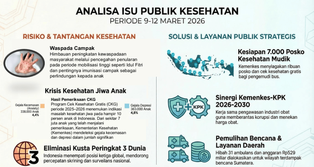 Pemberitaan di media massa selama kurun waktu 9-12 Maret 2026 menyoroti krisis kesehatan jiwa anak yang cukup mengkhawatirkan di Indonesia berdasarkan hasil Program Cek Kesehatan Gratis (CKG) periode 2025-2026. Dari sekitar 7 juta anak yang diperiksa, hampir 10 persen menunjukkan indikasi masalah kesehatan jiwa, dengan rincian 338.000 anak (4,4%) mengalami gejala kecemasan dan 363.000 anak (4,8%) mengalami gejala depresi. Selain itu, Indonesia juga menghadapi tantangan besar dalam eliminasi kusta karena saat ini menempati peringkat ketiga dunia, yang memicu percepatan langkah skrining dan surveilans nasional.