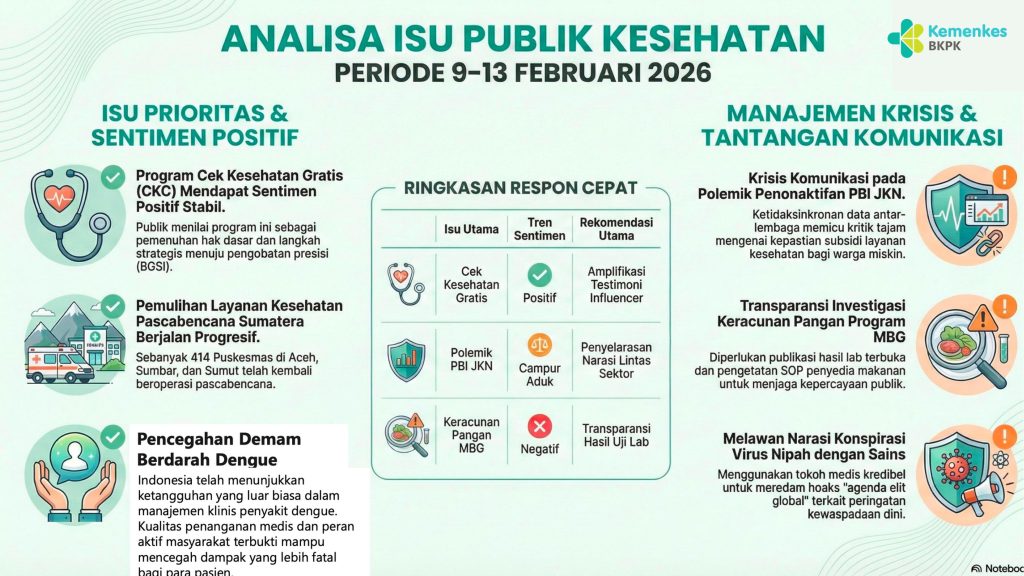 Laporan pemantauan media periode 9-13 Februari 2026 didominasi oleh polemik penonaktifan PBI JKN yang memicu sorotan tajam legislatif. Di sisi lain, program Cek Kesehatan Gratis (CKG) mencatatkan sentimen positif yang stabil.