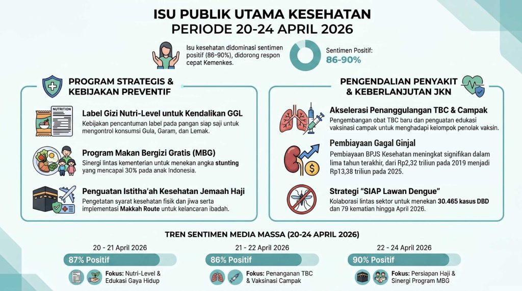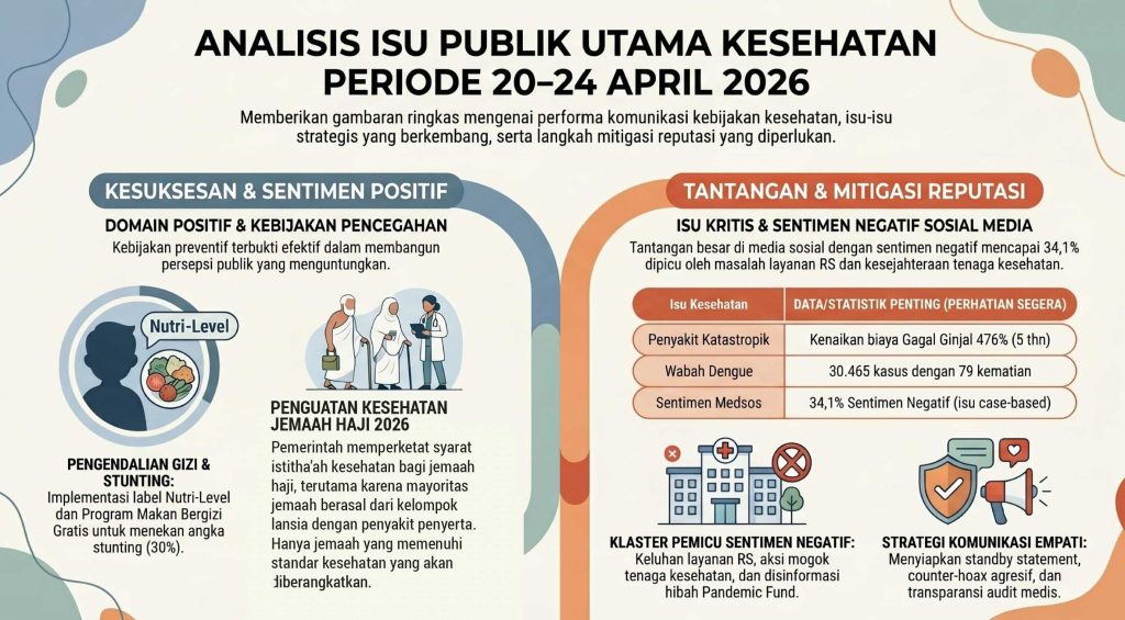 Analisis isu publik kesehatan periode 20-24 April 2026 menunjukkan dominasi sentimen positif (86-90%) di media massa, yang didorong oleh narasi kebijakan preventif dan respons cepat Kemenkes terhadap isu aktual. Namun, terdapat diskrepansi antara narasi kebijakan di media massa dengan sentimen di media sosial (mencapai 34,1% negatif) yang dipicu oleh isu berbasis kasus (case-based) seperti kualitas layanan RS dan kesejahteraan tenaga kesehatan. Strategi komunikasi ke depan harus bertransformasi dari sekadar diseminasi informasi menjadi mitigasi krisis berbasis empati dan penguatan data teknis untuk menjaga reputasi institusi.