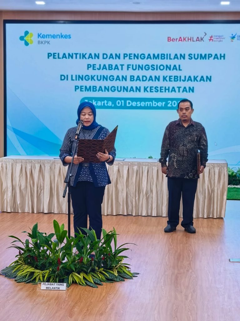 Jakarta– Sekretaris Badan Kebijakan Pembangunan Kesehatan (BKPK) Kementerian Kesehatan (Kemenkes), Etik Retno Wiyati, meminta tiga pejabat fungsional yang baru dilantik di lingkungan BKPK untuk segera merumuskan pola kerja dan indikator kinerja individu (IKI) yang selaras dengan tujuan organisasi. Permintaan ini disampaikan Etik dalam acara pelantikan dan pengambilan sumpah jabatan pada hari Senin (1/12/2025) secara luring di Jakarta.