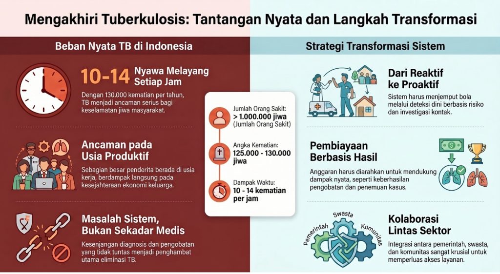 Tuberkulosis masih menjadi salah satu masalah kesehatan utama di Indonesia. Setiap tahun, lebih dari satu juta orang jatuh sakit akibat TB. Sekitar 125.000 hingga 130.000 meninggal dunia. Jika angka ini diterjemahkan ke dalam waktu, maka setiap jam, lebih dari 10 hingga 14 orang kehilangan nyawa. Dalam satu hari, ratusan keluarga berduka. Dalam satu tahun, kita kehilangan populasi setara kota kecil. Namun, angka tersebut hanyalah bagian dari cerita.