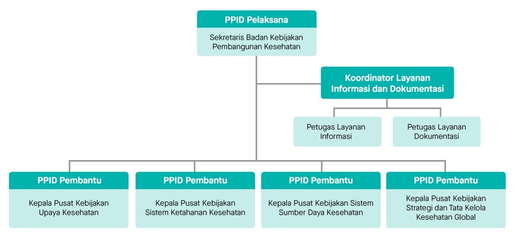 Pejabat Pengelola Informasi dan Dokumentasi Badan Kebijakan Pembangunan Kesehatan ditetapkan berdasarkan Surat Keputusan kepala Badan Kebijakan Pembangunan Kesehatan No. HK.02.02/H/271/2025 Tentang Pejabat Pengelola Informasi dan Dokumentasi di lingkungan Badan Kebijakan Pembangunan Kesehatan. Pejabat Pengelola Informasi dan Dokumentasi di lingkungan Badan Kebijakan Pembangunan Kesehatan, yang selanjutnya disingkat PPID terdiri atas :