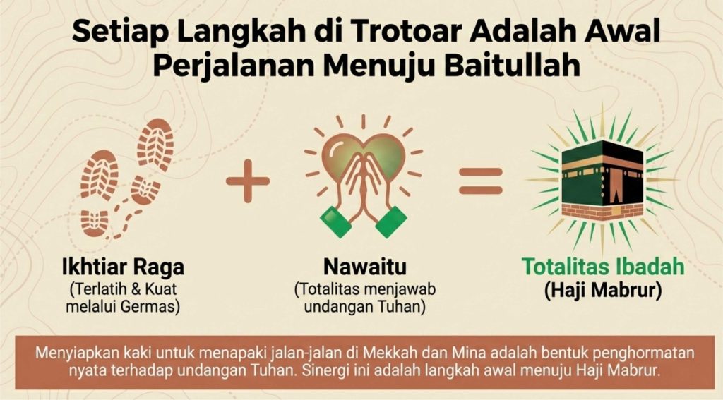 Berlatih jalan kaki di tanah air minimal 3-6 bulan sebelum keberangkatan adalah bentuk ikhtiar memenuhi perintah agama untuk mempersiapkan bekal terbaik. Bekal bukan hanya soal materi, tapi juga kekuatan fisik untuk melaksanakan rukun haji secara mandiri tanpa membebani orang lain atau petugas lapangan yang sudah memikul tanggung jawab besar.